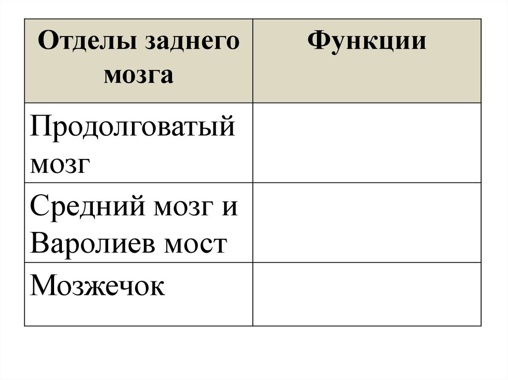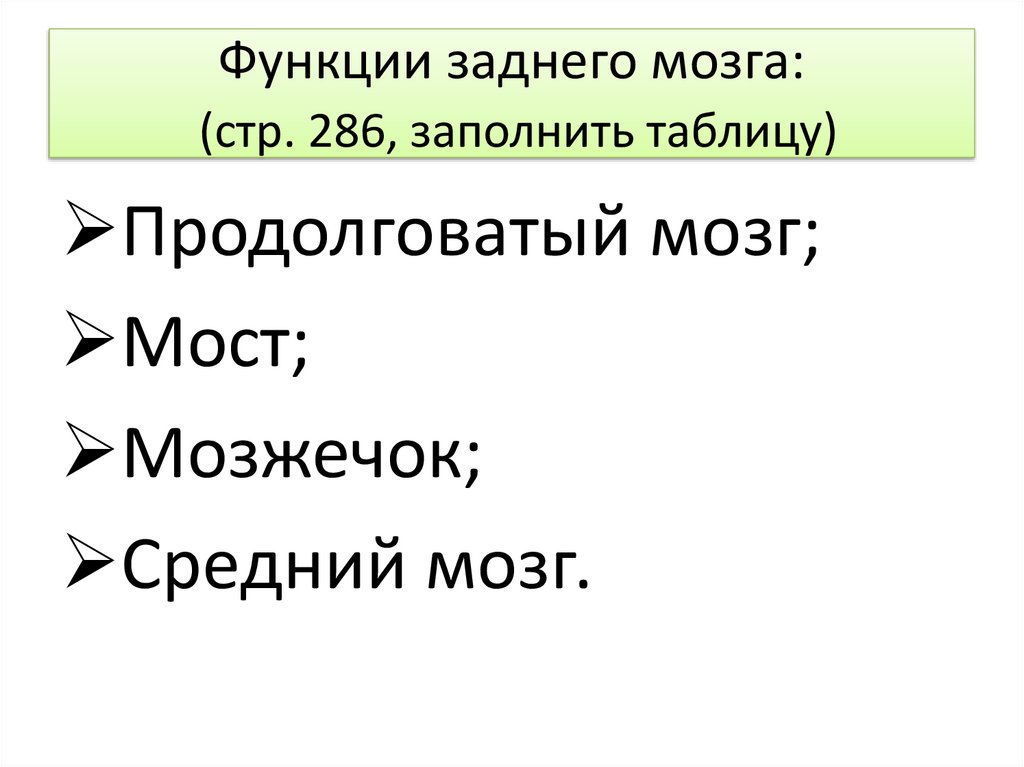 Функции заднего мозга:(стр. 286, заполнить таблицу)