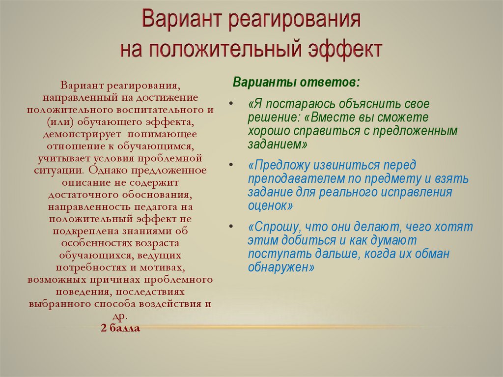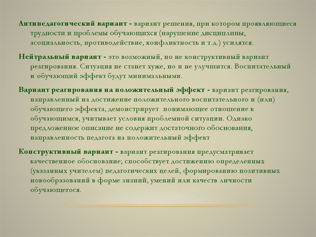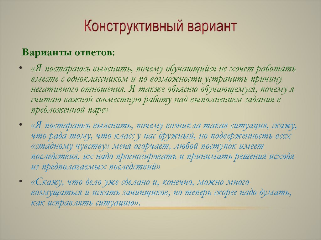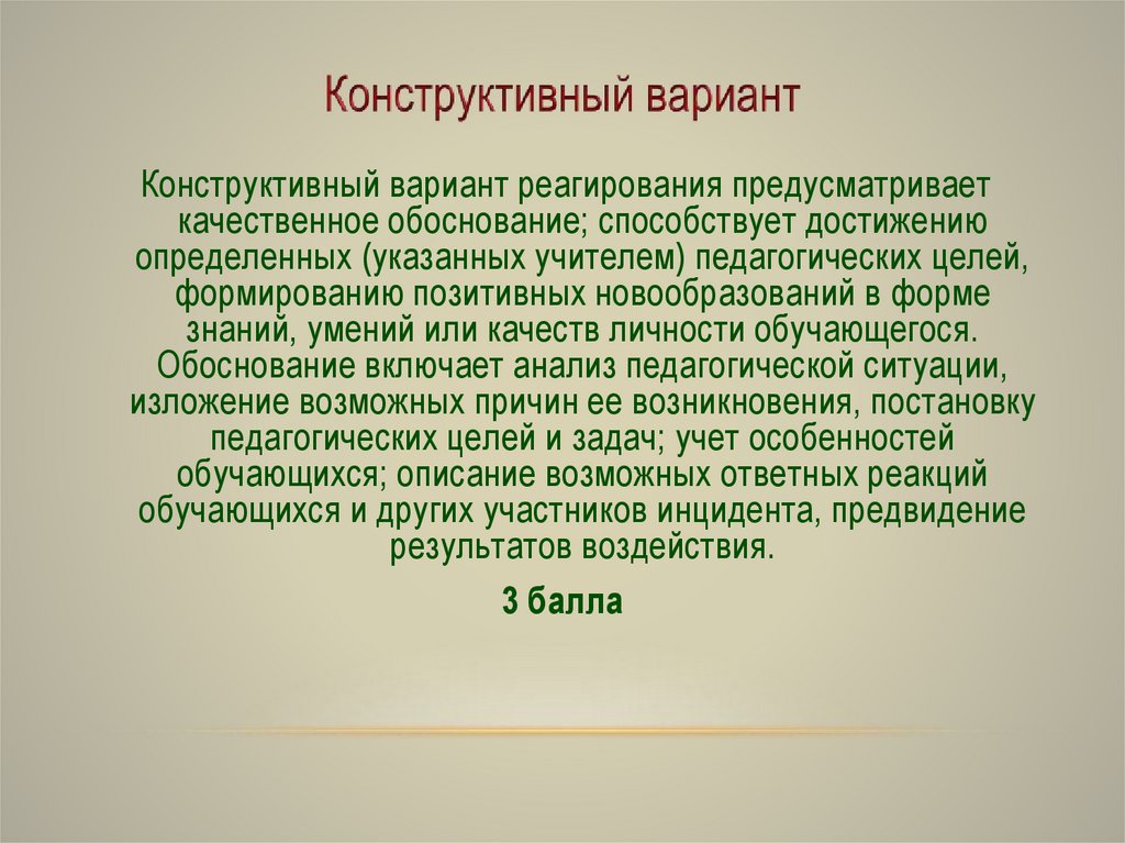 Конструктивный вариант реагирования предусматриваеткачественное обоснование; способствует достижению