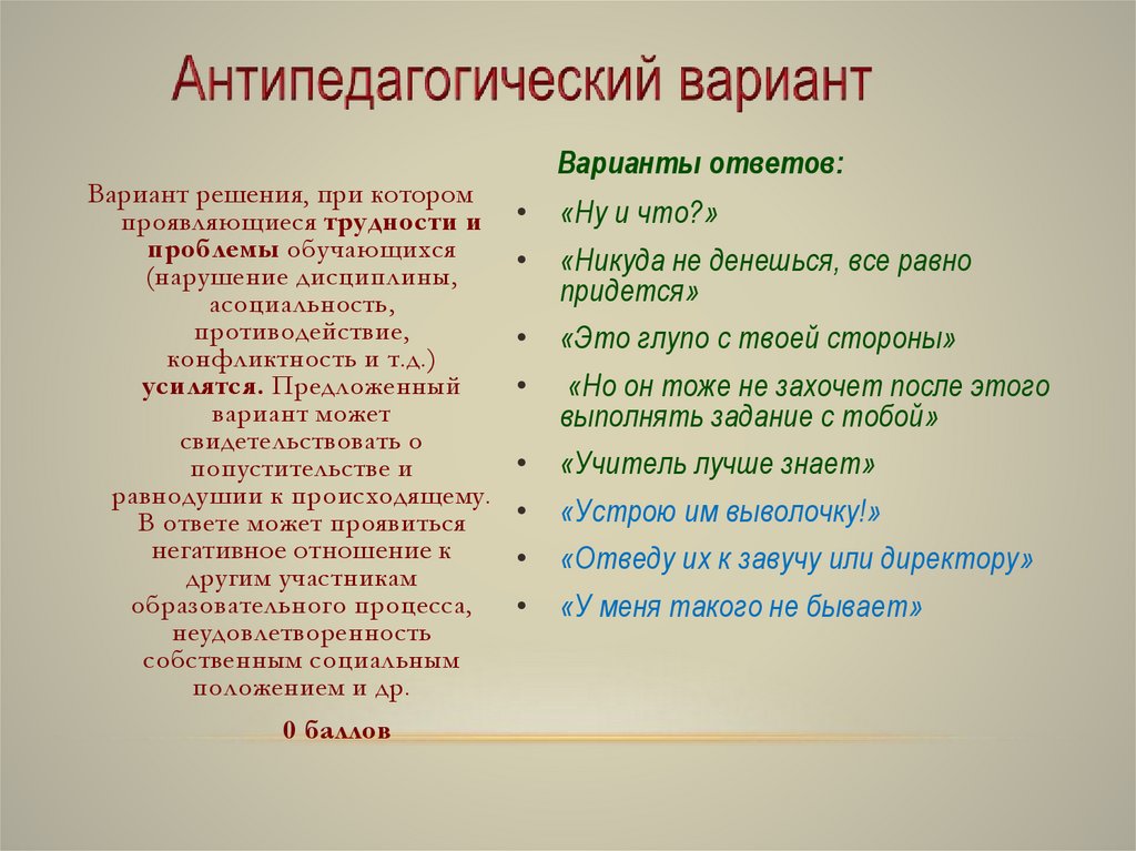 Варианты ответов:• «Я постараюсь выяснить, почему обучающийся не хочет работать