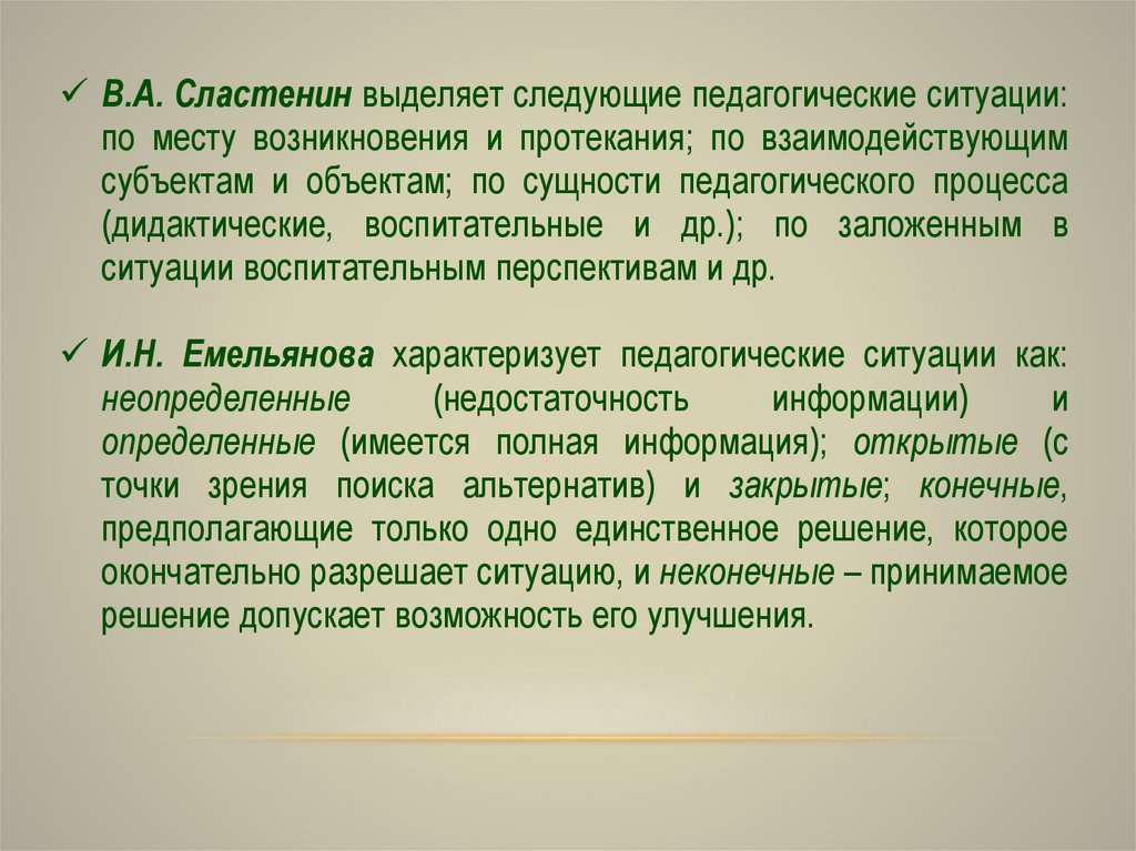 И.Н. Емельянова характеризует педагогические ситуации как: