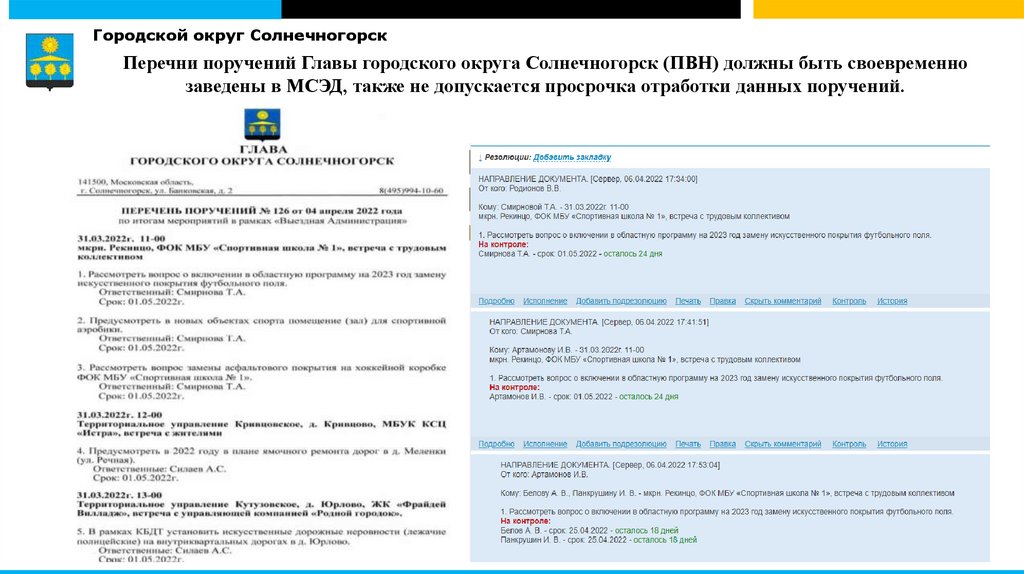 Городской округ СолнечногорскПеречни поручений Главы городского округа Солнечногорск (ПВН) должны быть своевременно
