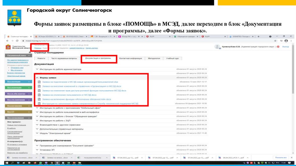 Городской округ СолнечногорскФормы заявок размещены в блоке «ПОМОЩЬ» в МСЭД, далее переходим в блок «Документация