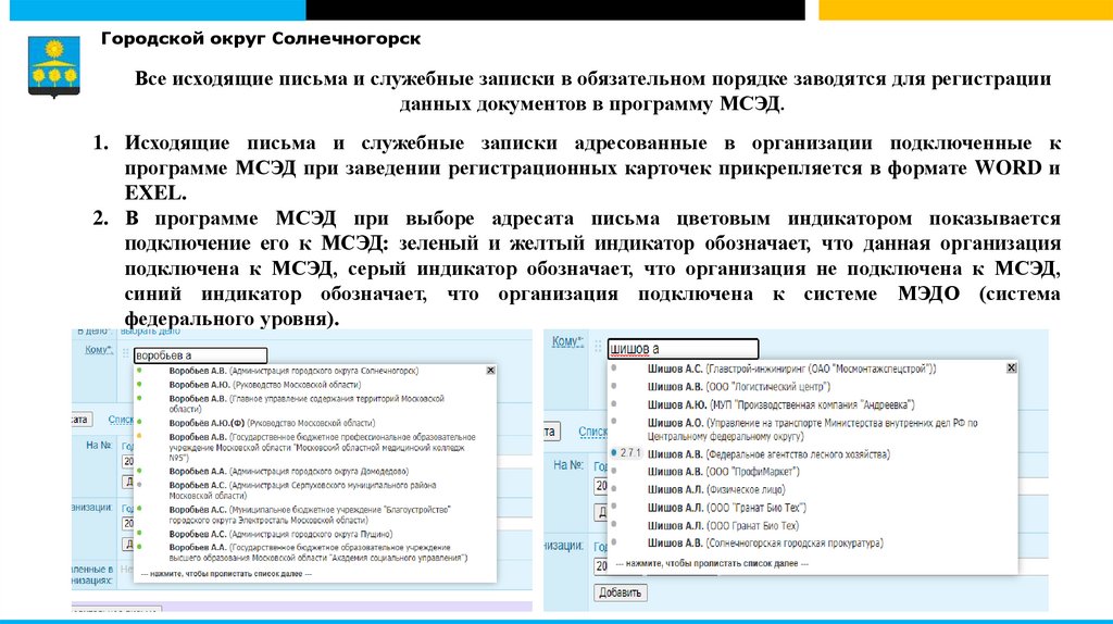 Городской округ СолнечногорскВсе исходящие письма и служебные записки в обязательном порядке заводятся для регистрации