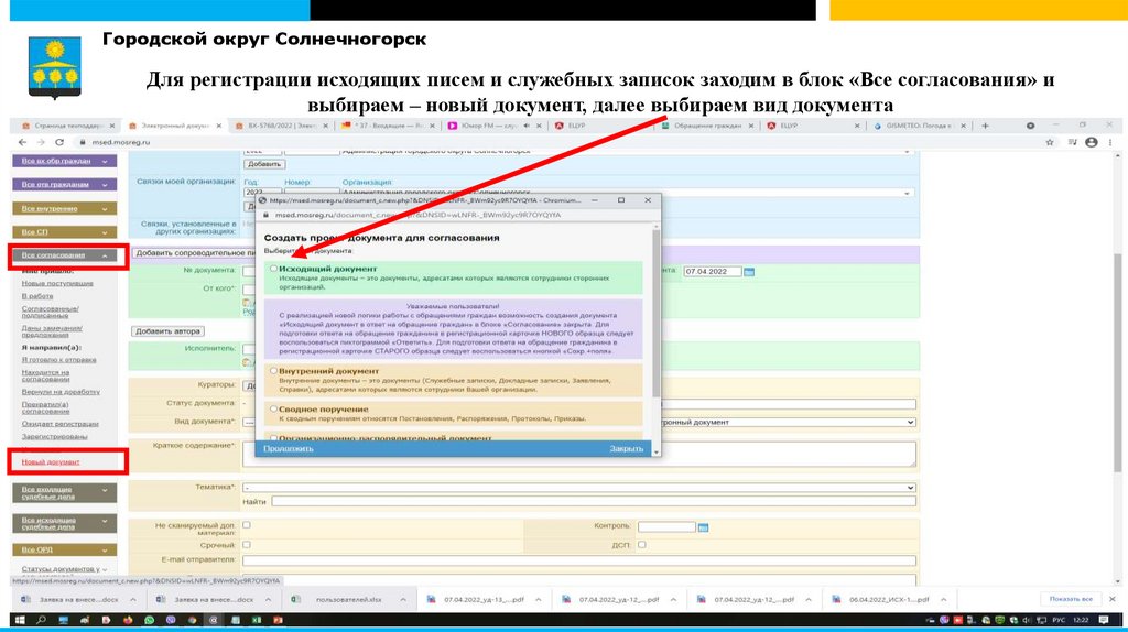 Городской округ СолнечногорскДля регистрации исходящих писем и служебных записок заходим в блок «Все согласования» и
