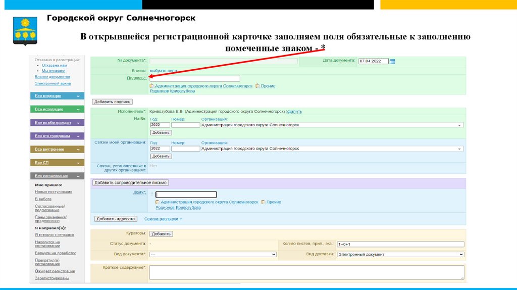Городской округ СолнечногорскВ открывшейся регистрационной карточке заполняем поля обязательные к заполнению
