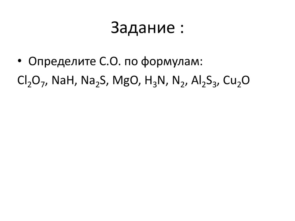 • Cl-1 – хлорид; O-2 – оксид; Н-1 – гидрид;