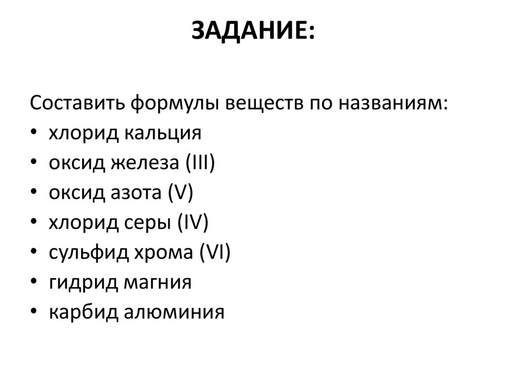 ЗАДАНИЕ:Составить формулы веществ по названиям: