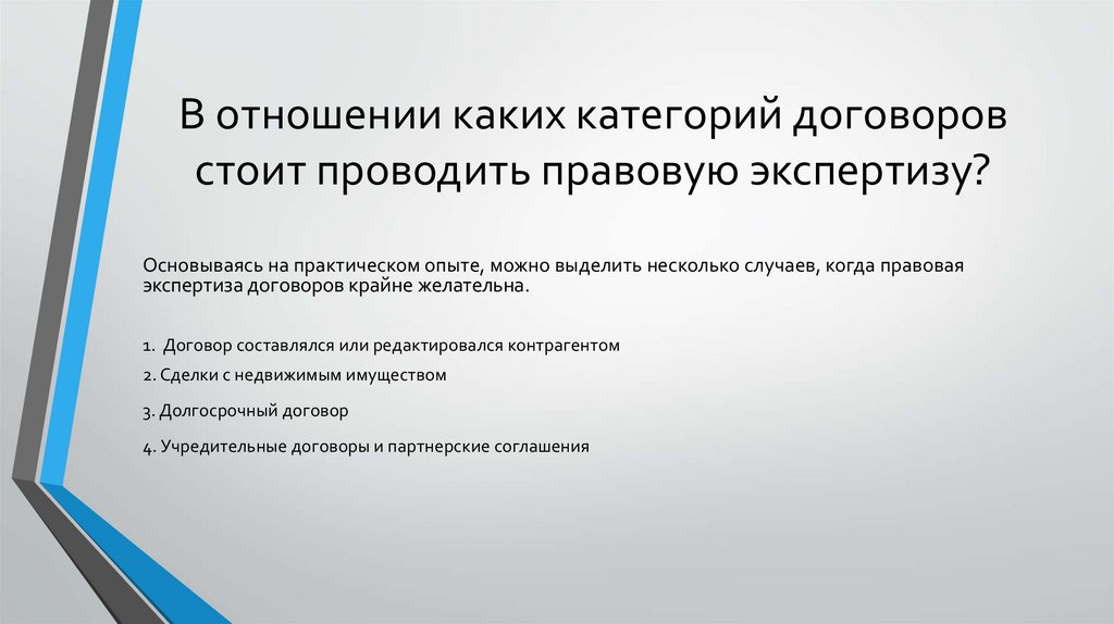 В отношении каких категорий договоровстоит проводить правовую экспертизу?