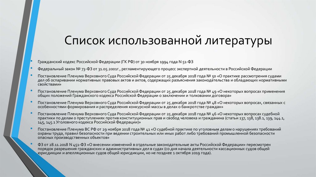 Список использованной литературыГражданский кодекс Российской Федерации (ГК РФ) от 30 ноября 1994 года N 51-ФЗ