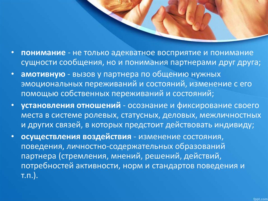 • понимание - не только адекватное восприятие и пониманиесущности сообщения, но и понимания партнерами друг друга;