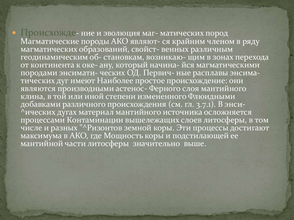 Происхожде- ние и эволюция маг- матических породМагматические породы АКО являют- ся крайним членом в ряду