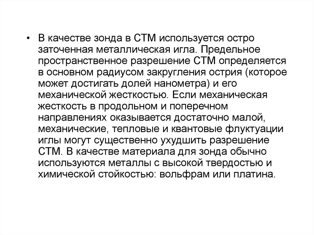 • В качестве зонда в СТМ используется острозаточенная металлическая игла. Предельное