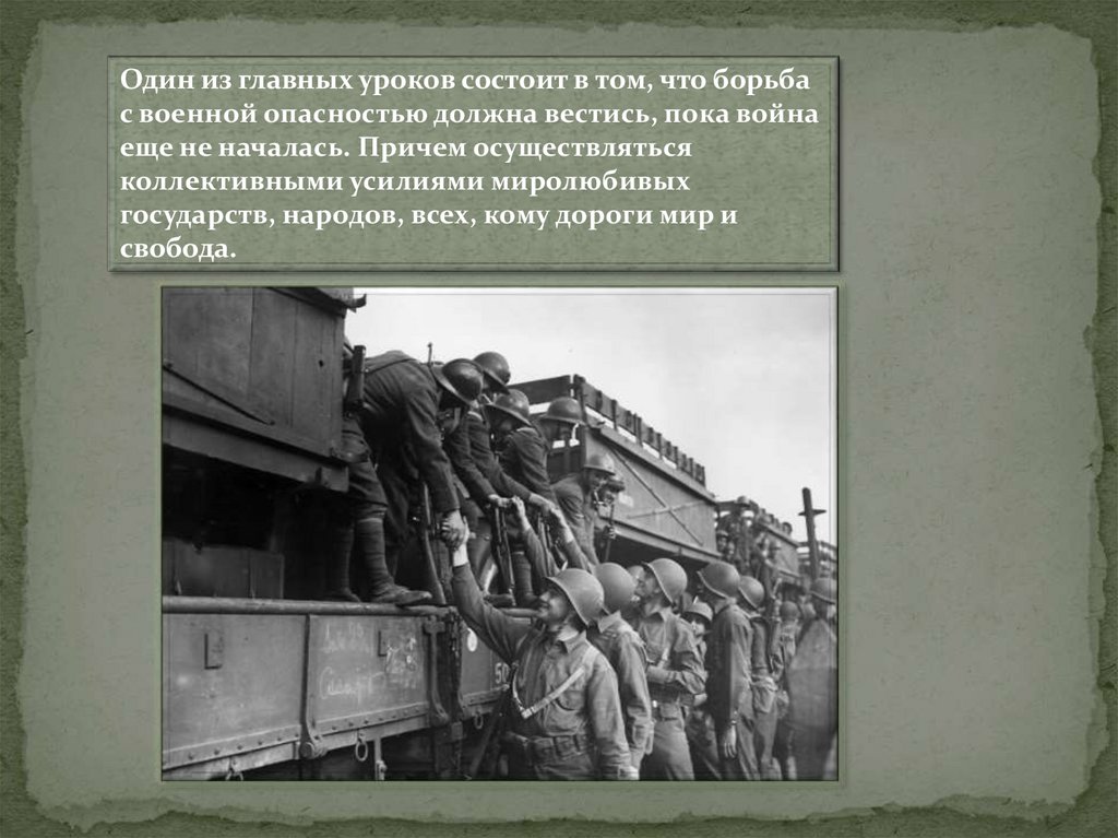 Один из главных уроков состоит в том, что борьбас военной опасностью должна вестись, пока война