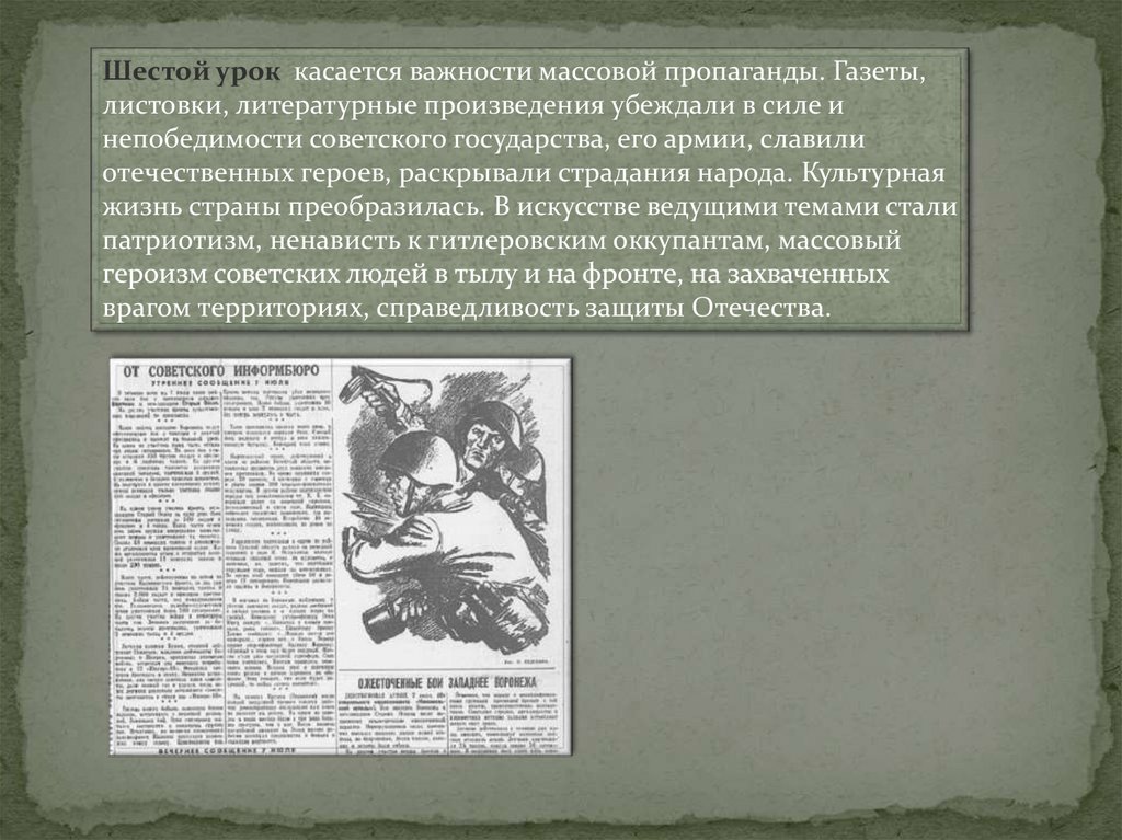 Шестой урок касается важности массовой пропаганды. Газеты,листовки, литературные произведения убеждали в силе и