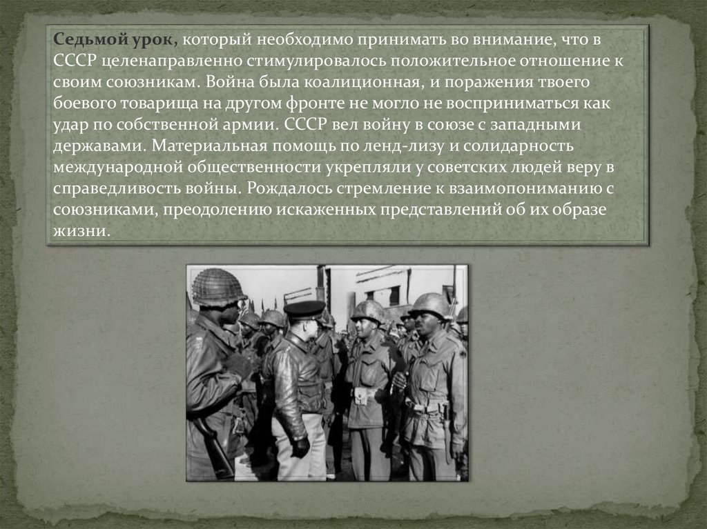 Седьмой урок, который необходимо принимать во внимание, что вСССР целенаправленно стимулировалось положительное отношение к