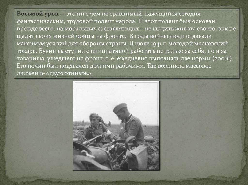 Восьмой урок —это ни с чем не сравнимый, кажущийся сегодняфантастическим, трудовой подвиг народа. И этот подвиг был основан,