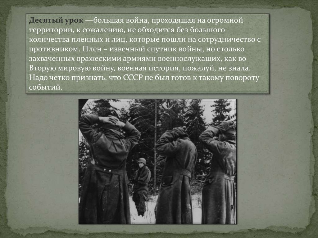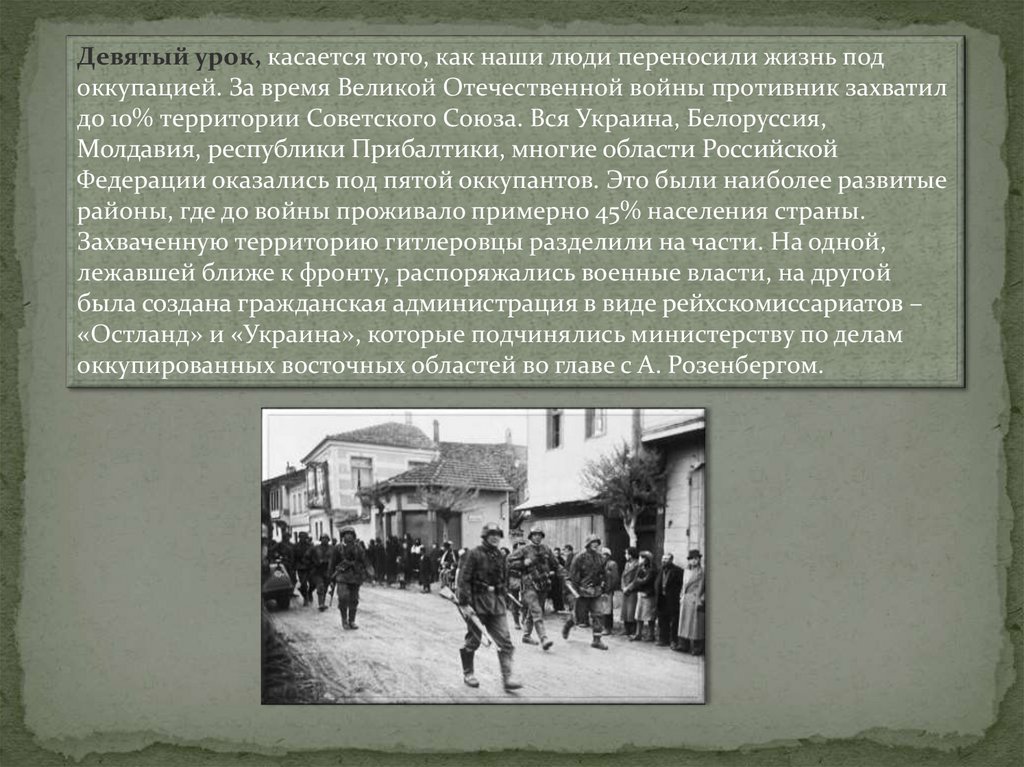 Девятый урок, касается того, как наши люди переносили жизнь подоккупацией. За время Великой Отечественной войны противник захватил