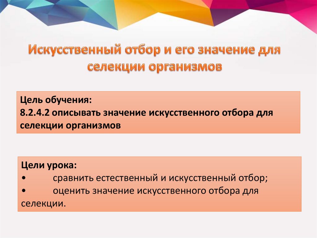 Цель обучения:8.2.4.2 описывать значение искусственного отбора для