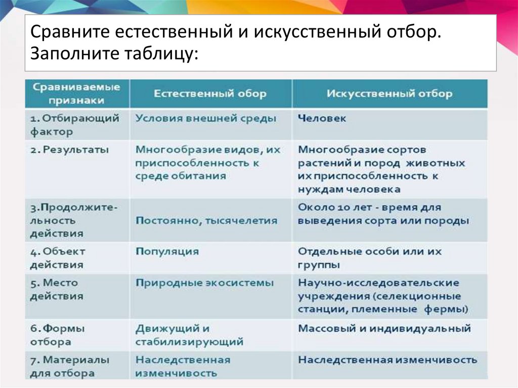 Сравните естественный и искусственный отбор.Заполните таблицу: