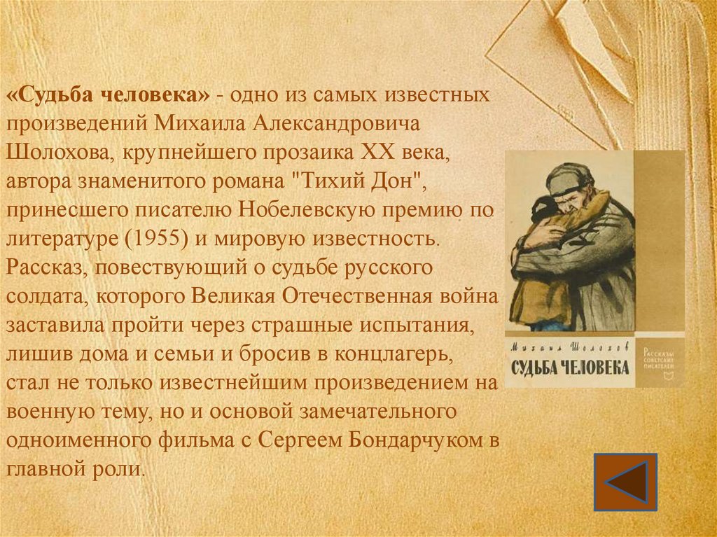 «Судьба человека» - одно из самых известныхпроизведений Михаила Александровича