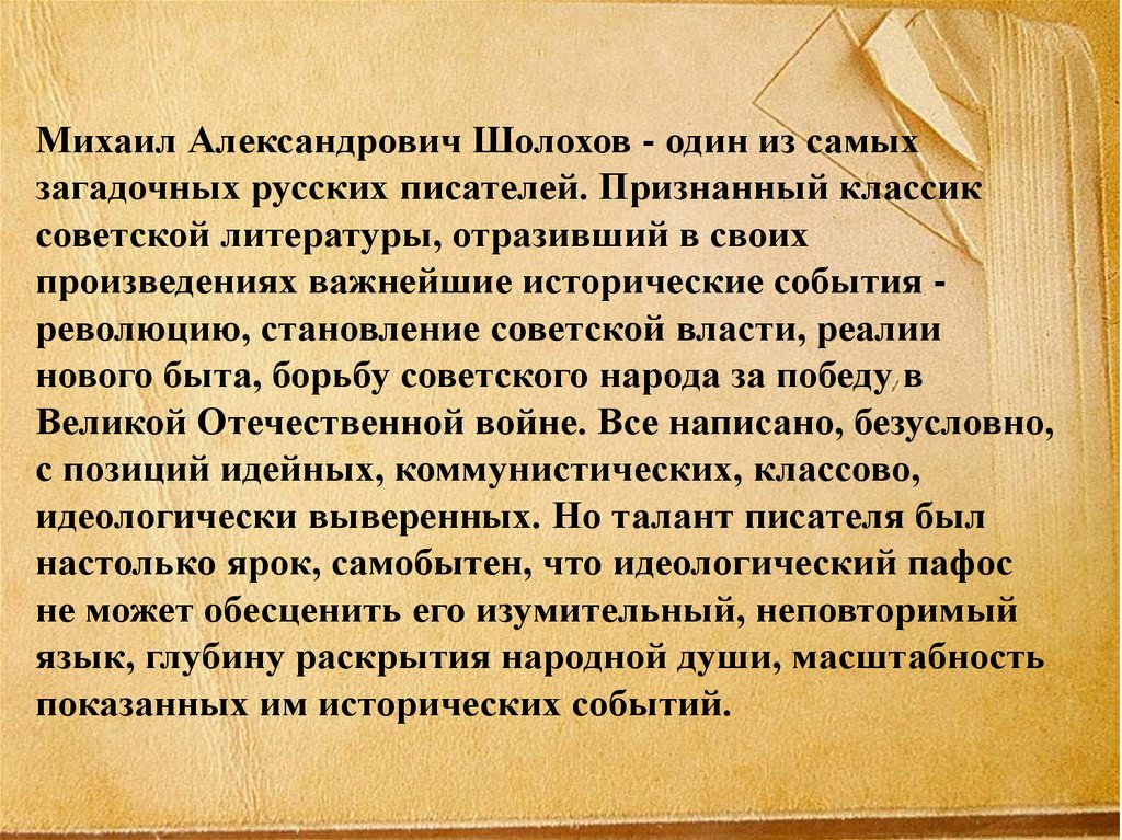 Михаил Александрович Шолохов - один из самыхзагадочных русских писателей. Признанный классик