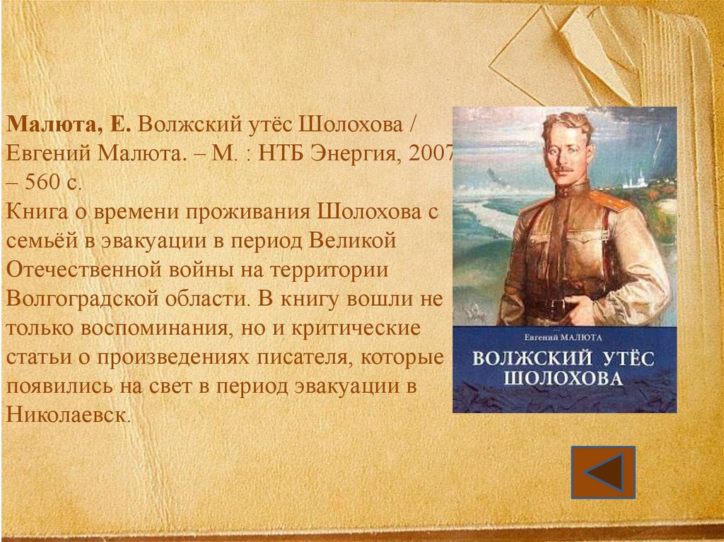 Малюта, Е. Волжский утёс Шолохова /Евгений Малюта. – М. : НТБ Энергия, 2007.