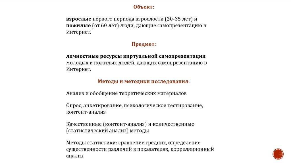 Объект:взрослые первого периода взрослости (20-35 лет) и