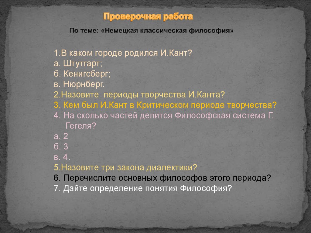 1.В каком городе родился И.Кант?а. Штутгарт;