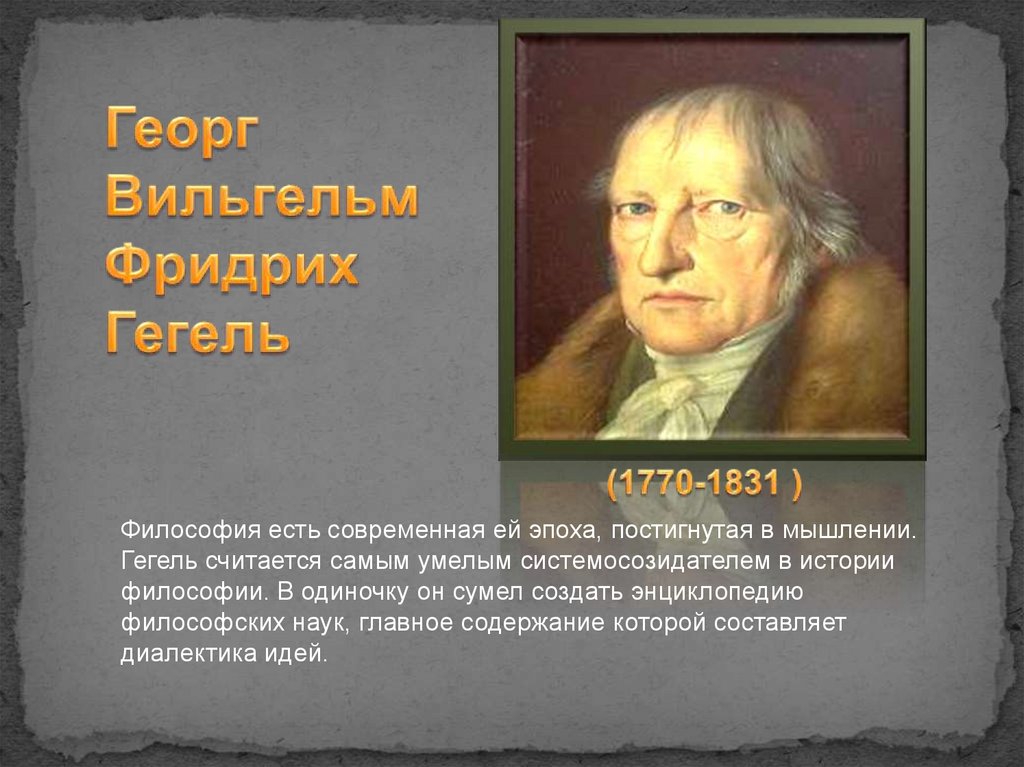 Философия есть современная ей эпоха, постигнутая в мышлении.Гегель считается самым умелым системосозидателем в истории