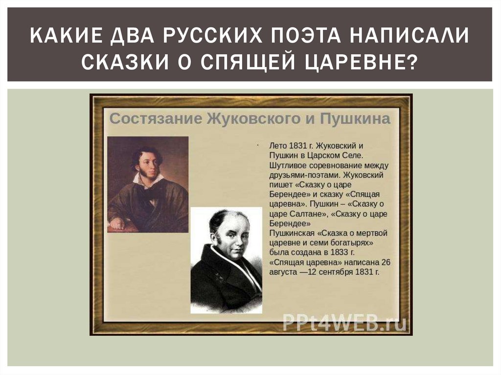 КАКИЕ ДВА РУССКИХ ПОЭТА НАПИСАЛИСКАЗКИ О СПЯЩЕЙ ЦАРЕВНЕ?