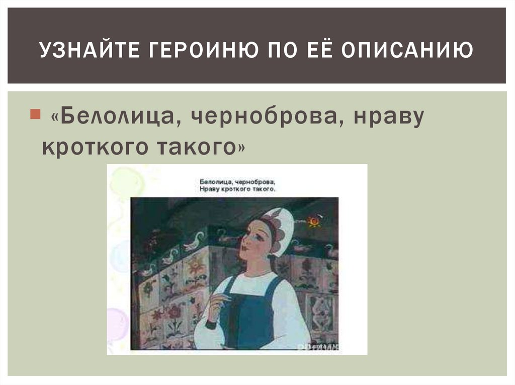 УЗНАЙТЕ ГЕРОИНЮ ПО ЕЁ ОПИСАНИЮ«Белолица, черноброва, нраву