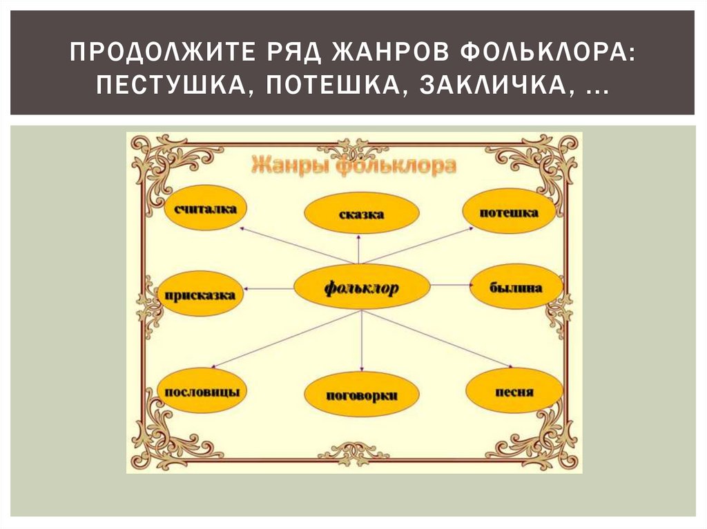 ПРОДОЛЖИТЕ РЯД ЖАНРОВ ФОЛЬКЛОРА:ПЕСТ УШКА , ПОТЕШКА , ЗАКЛИЧКА , ...