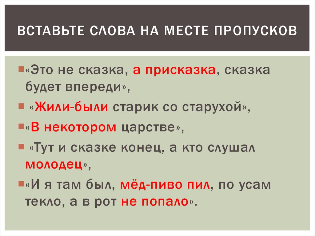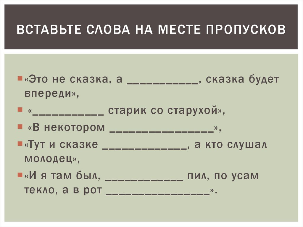 ВСТАВЬТЕ СЛОВА НА МЕСТЕ ПРОПУСКОВ«Это не сказка, а присказка, сказка