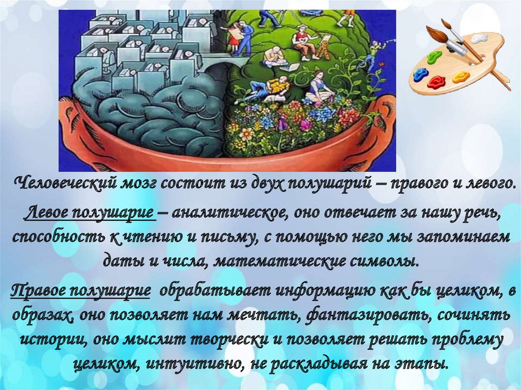 Человеческий мозг состоит из двух полушарий – правого и левого.Левое полушарие – аналитическое, оно отвечает за нашу речь,