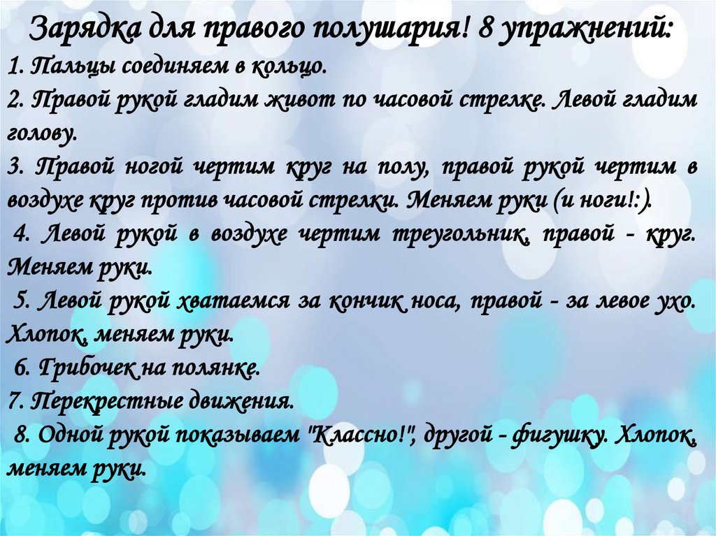 Зарядка для правого полушария! 8 упражнений:1. Пальцы соединяем в кольцо.