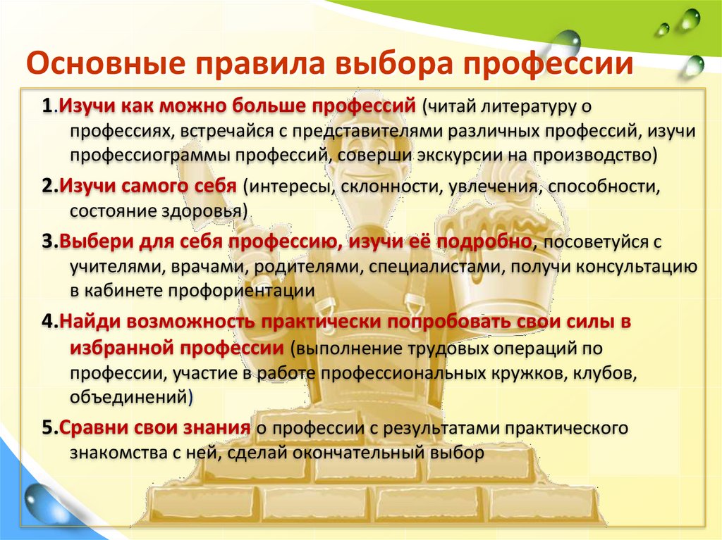 Основные правила выбора профессии1.Изучи как можно больше профессий (читай литературу о