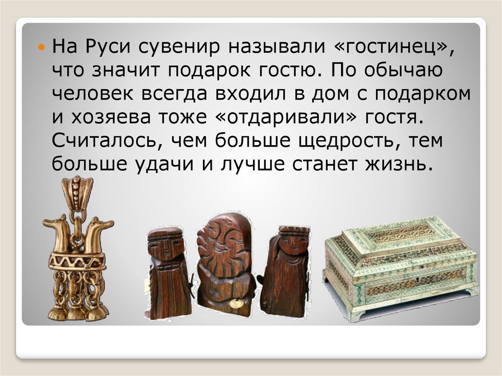 На Руси сувенир называли «гостинец»,что значит подарок гостю. По обычаю