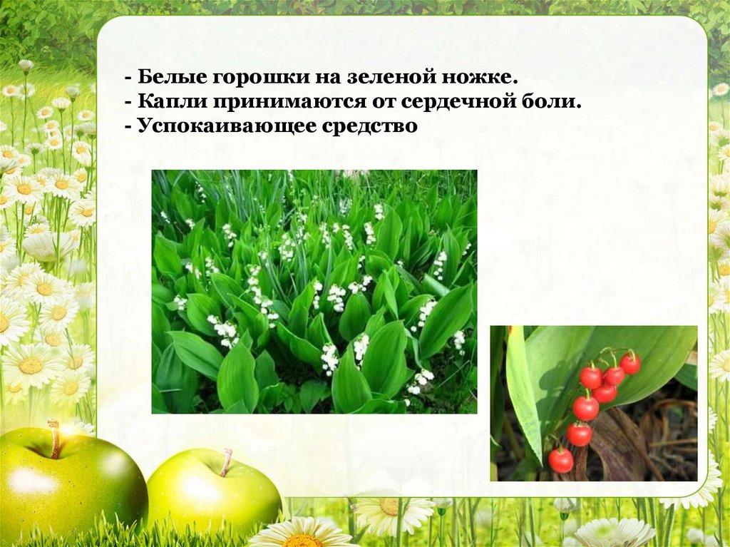 - Белые горошки на зеленой ножке.- Капли принимаются от сердечной боли.