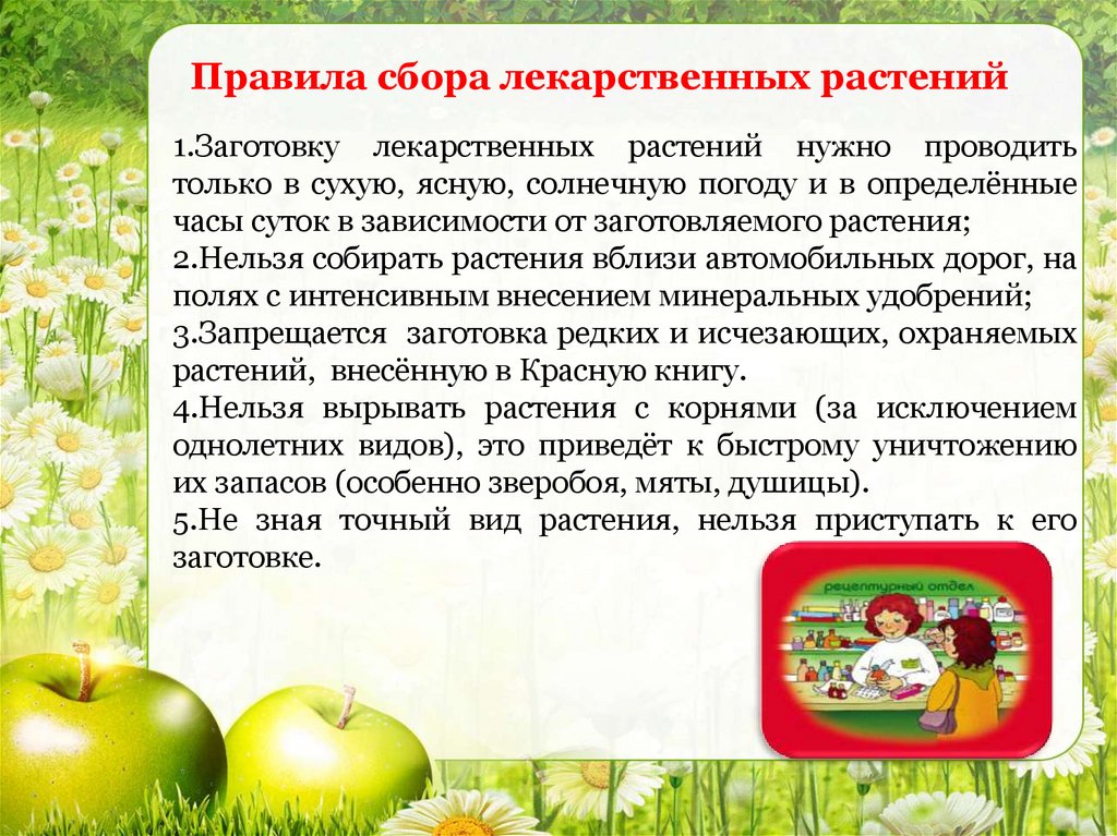 Правила сбора лекарственных растений1.Заготовку лекарственных растений нужно проводить