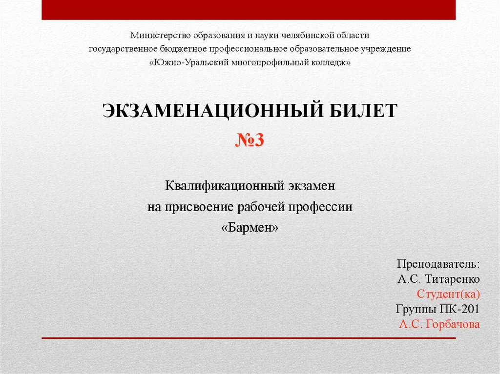 Экзаменационный билет №3. Квалификационный экзамен на присвоение рабочей профессии «Бармен»
