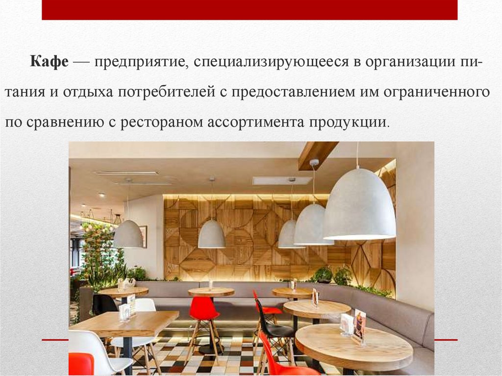 Кафе — предприятие, специализирующееся в организации питания и отдыха потребителей с предоставлением им ограниченногопо сравнению с рестораном ассортимента продукции.