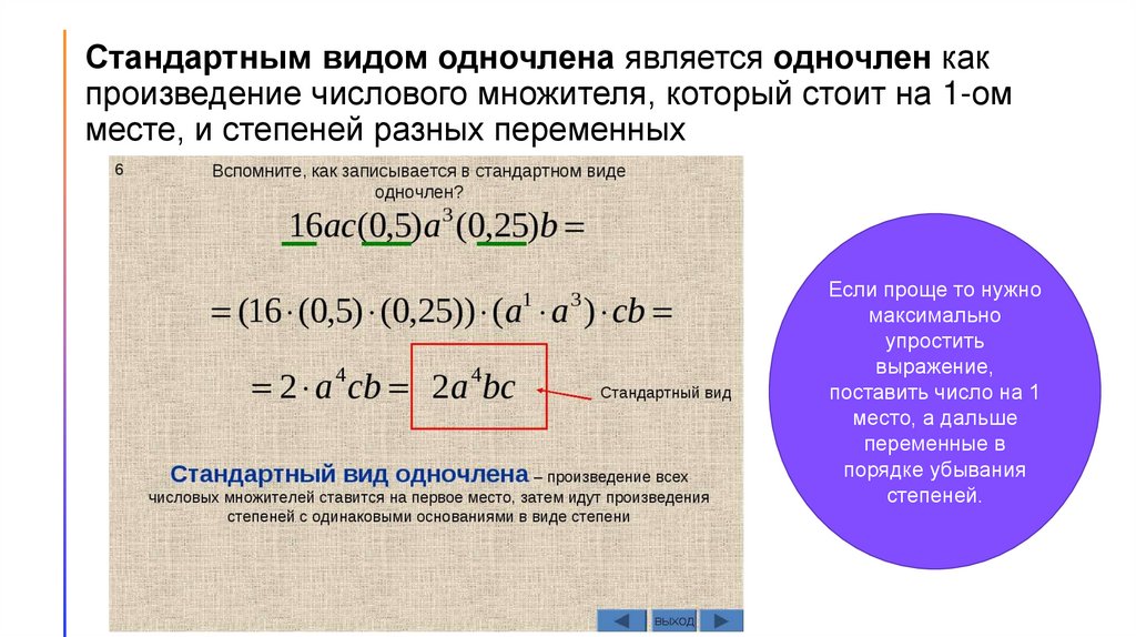 Стандартным видом одночлена является одночлен какпроизведение числового множителя, который стоит на 1-ом