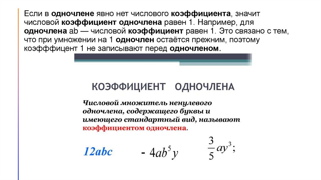 одночлена ab — числовой коэффициент равен 1. Это связано с тем,