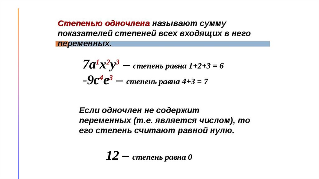 Если в одночлене явно нет числового коэффициента, значитчисловой коэффициент одночлена равен 1. Например, для