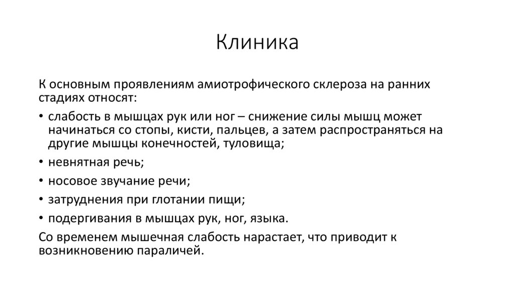 КлиникаК основным проявлениям амиотрофического склероза на ранних