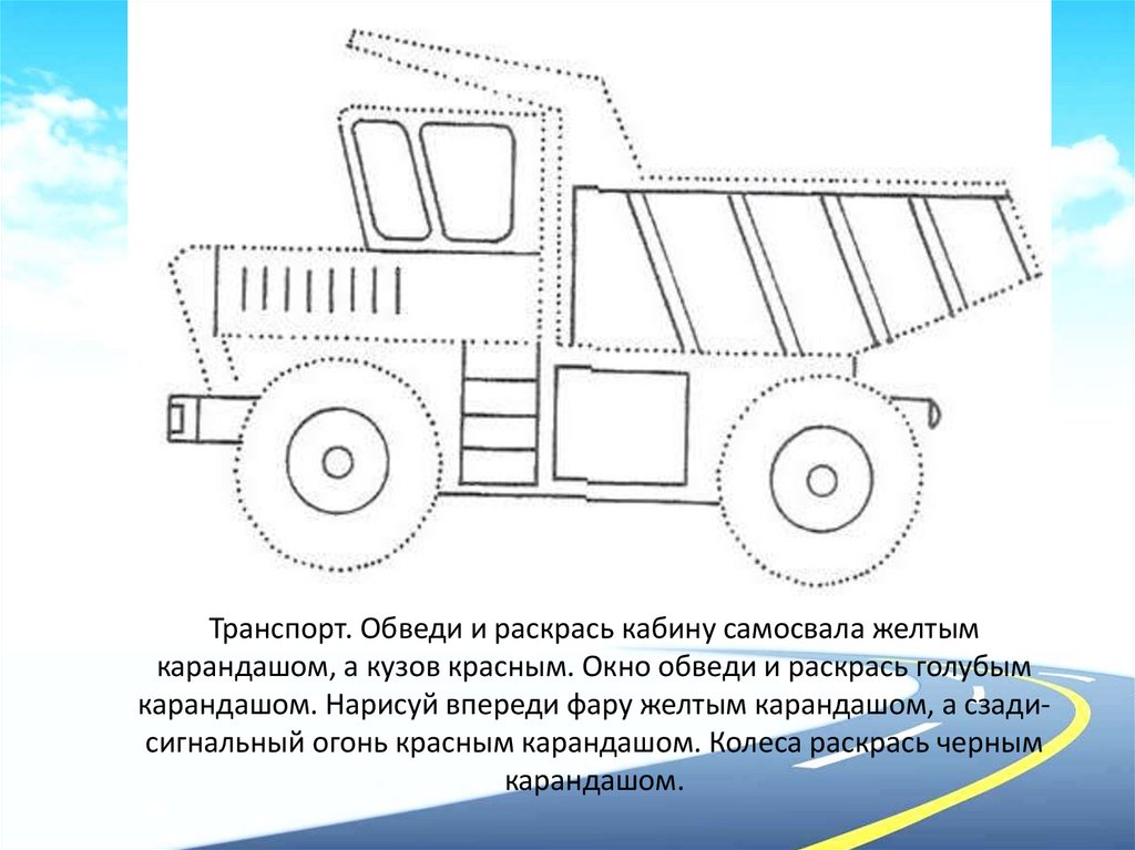 Транспорт.Транспорт. Обведи и раскрась кабину самосвала желтым