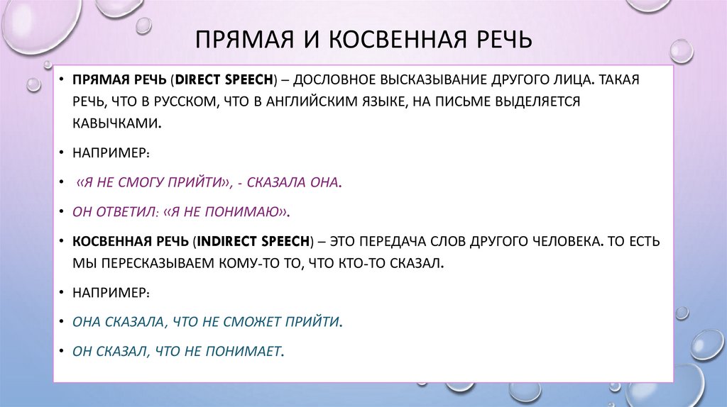 • КОСВЕННАЯ РЕЧЬ (INDIRECT SPEECH) – ЭТО ПЕРЕДАЧА СЛОВ ДРУГОГО ЧЕЛОВЕКА. ТО ЕСТЬ