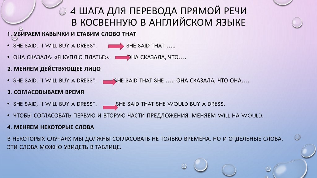 4 ШАГА ДЛЯ ПЕРЕВОДА ПРЯМОЙ РЕЧИВ КОСВЕННУЮ В АНГЛИЙСКОМ ЯЗЫКЕ