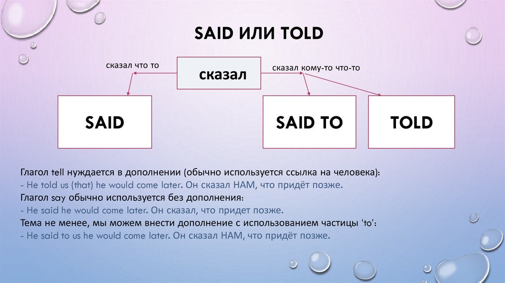 - He told us (that) he would come later. Он сказал НАМ, что придёт позже.