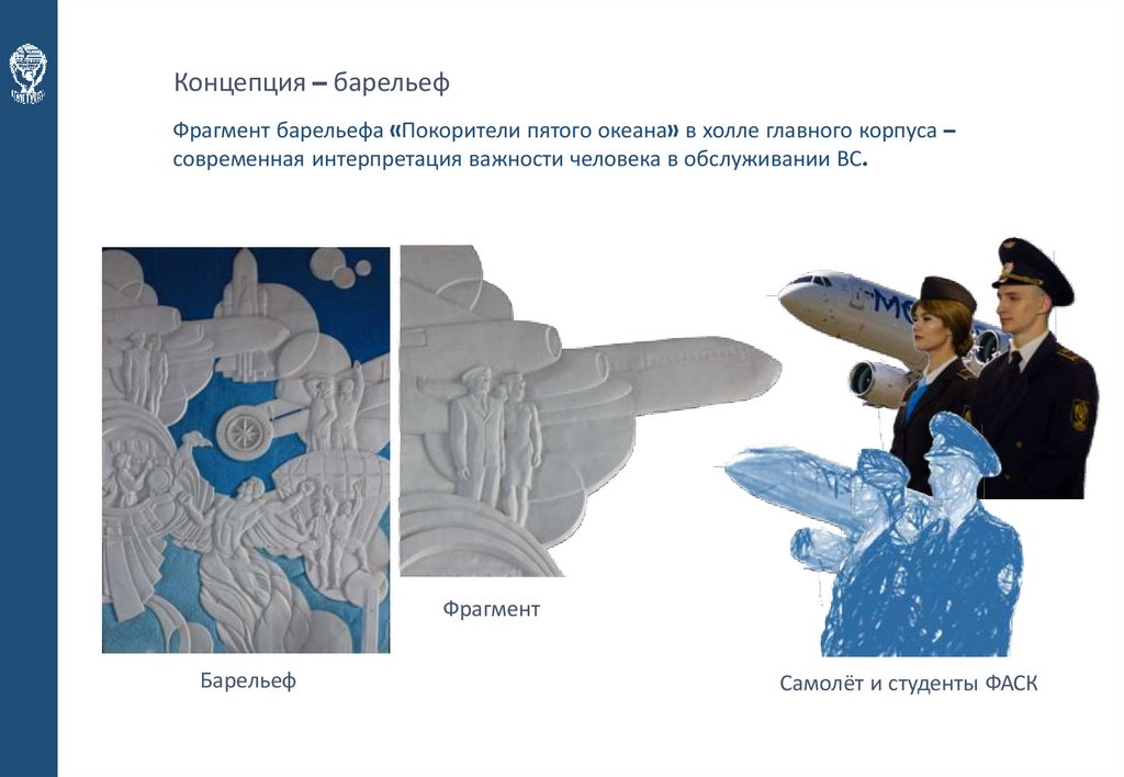 Концепция – барельефФрагмент барельефа «Покорители пятого океана» в холле главного корпуса –